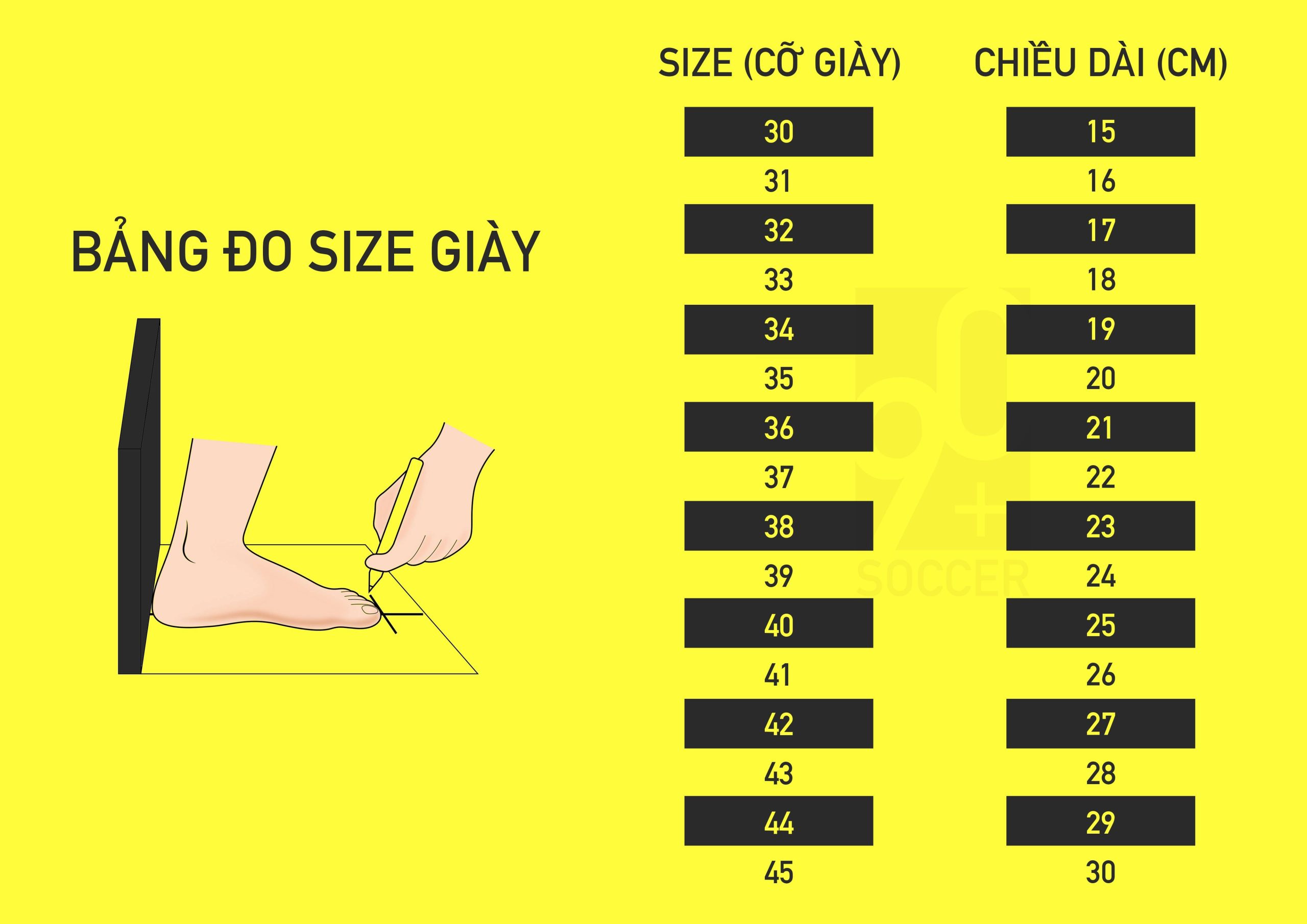 - Size là biểu thị chiều dài, khi chọn các bạn nên chọn giày có chiều dài lớn hơn chân từ 0.7 – 1 cm vì lúc sút bóng thì chân sẽ xô lên trước và không bị đau ngón.